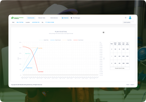 Fitur ini memvisualisasikan perbandingan antara rencana pengeboran dan realisasi lapangan dalam hal waktu, biaya, dan kedalaman. Ini membantu tim mengevaluasi kinerja harian dan mendeteksi penyimpangan dengan lebih cepat dan akurat. Keuntungan Utama: Grafik harian untuk Rencana vs Aktual Waktu, Biaya, dan Kedalaman Deteksi penyebab keterlambatan atau pembengkakan biaya Alat evaluasi yang efektif untuk rapat harian & tinjauan proyek