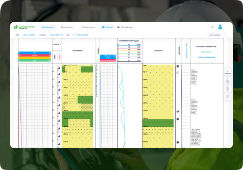 Platform analisis potongan batu untuk memahami kondisi geologi bawah permukaan secara waktu nyata. Data potongan terhubung dengan parameter pengeboran untuk mendukung pengambilan keputusan selama pengeboran. Keuntungan Utama: Evaluasi zona prospek dan hidrokarbon yang lebih akurat Interpretasi litologi, tampilan gas, dan mineral langsung dari rig Visualisasi digital dari potongan dan integrasi data kedalaman